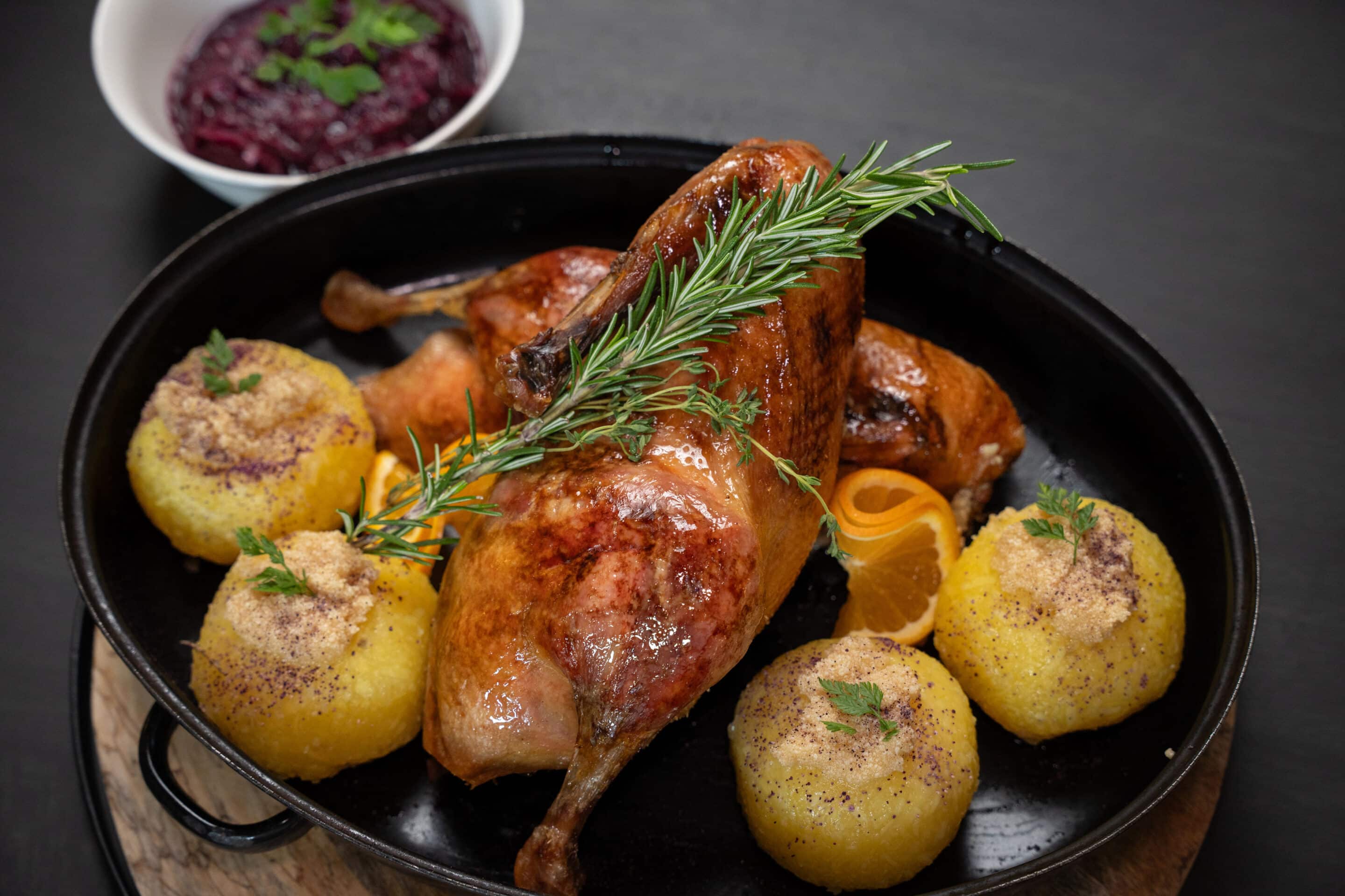Ente satt – ausgelöst & herrlich knusprig, dazu servieren wir Knödel & Blaukraut.